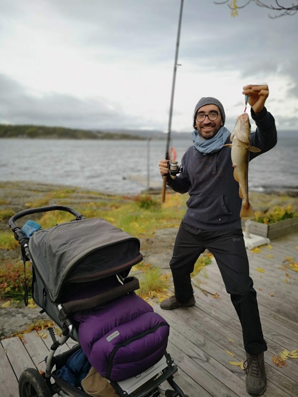 Canne à pêche, poussette, porte-bébé et un cabillaud d’un kilo!